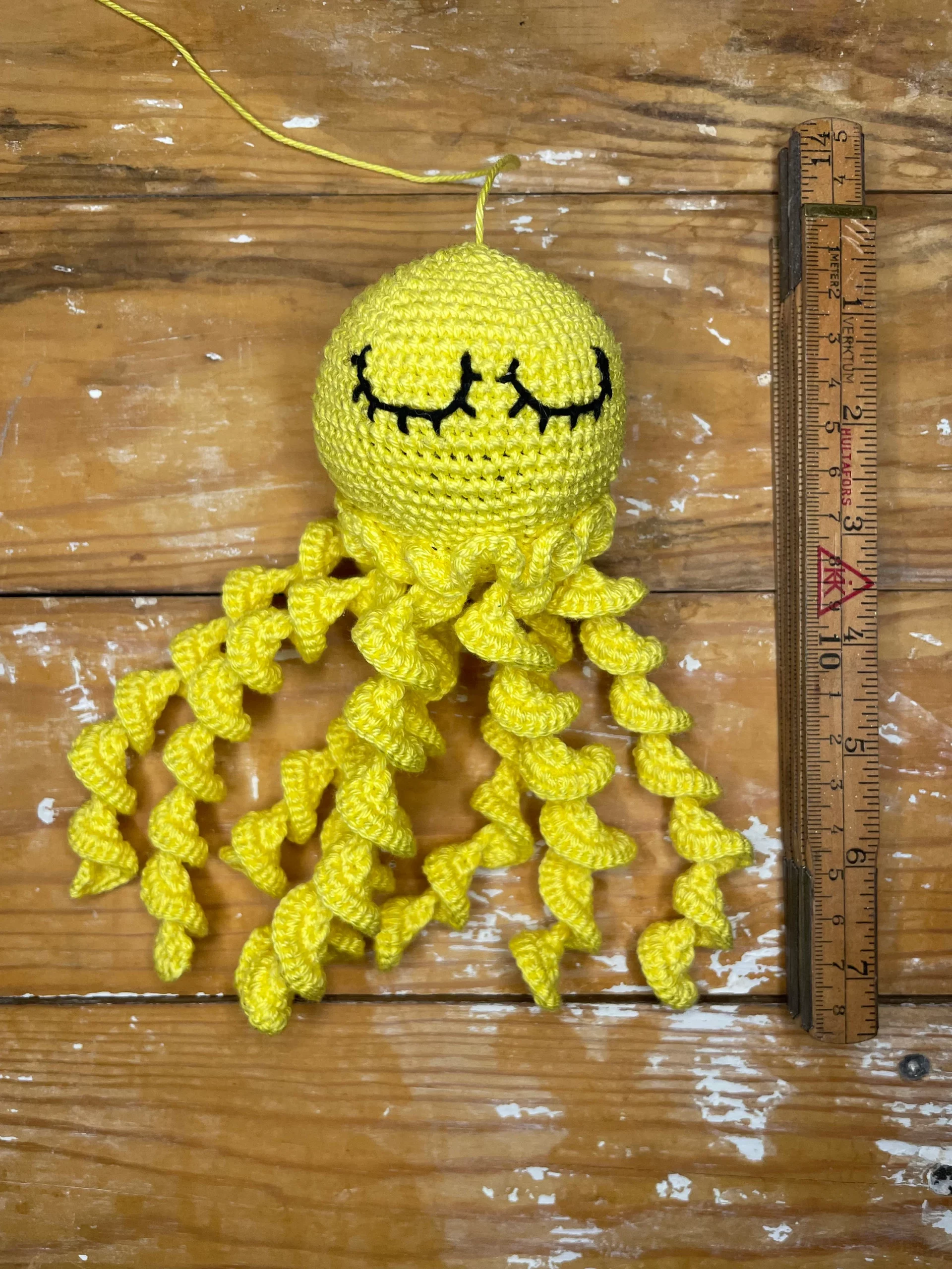 Mönstret följer reglerna för initiativet Octopus for Premature Babies (kroppen inte längre än 9 cm, tentaklerna inte längre än 20 cm när de är utsträckta). Ingen hårdplast eller farliga föremål används.